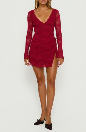 Lovely floral lace romances this shapely stretch-kissed dress cut in a leggy length and accented with dainty side bows.