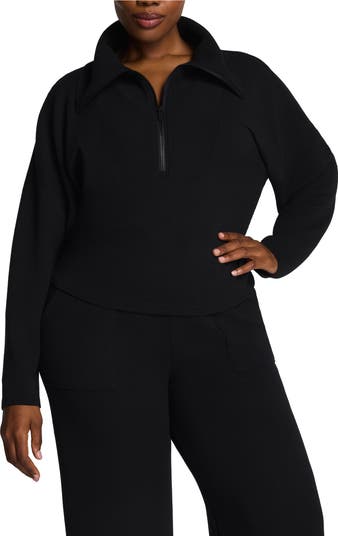 A quarter-zip pullover cut from soft, fleecy fabric features rib-knit panels at the bib and sleeves for extra snugness.
