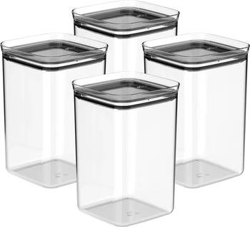 Maximize your pantry space with this 3.7 quart airtight food storage container set including four jars and four lids. Made from BPA free clear polystyrene plastic, it provides durable safe storage for large quantities of dry goods such as rice, cereal, pasta, beans, snacks, or baking essentials. The silicone sealed lid creates a secure airtight closure that locks in freshness while keeping out air, moisture, and pests. Its modular stackable shape fits neatly into cabinets, shelves, or deep drawers, and the transparent body allows quick content identification at a glance. Beyond the kitchen, this versatile container is also useful for organizing coffee stations, office supplies, toys, or craft materials. Built for daily use, it offers a practical clutter reducing solution with a clean modern look. Hand wash only. Not microwave, freezer, or dishwasher safe.