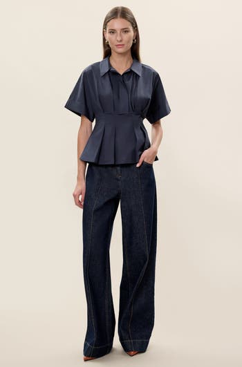 An updated take on one of our best-selling silhouettes. Cut from crisp cotton poplin, this tailored short-sleeve peplum top features sharp pleats through the waist for structure and shape. The fit is clean and flattering. Wear it with wide-leg denim, tailored trousers, or layered under a jacket—it's easy to style and made to work hard in your wardrobe.