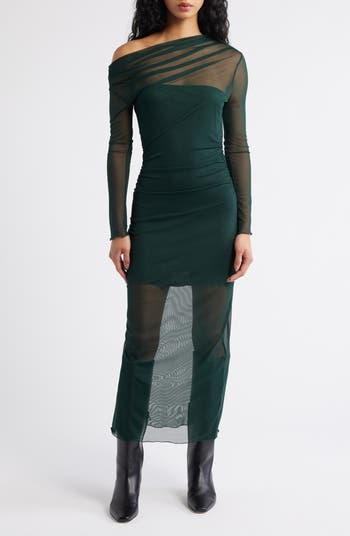An asymmetric boat neckline tops this chic long-sleeve midi dress styled with a semisheer overlay that creates the illusion of floating movement.