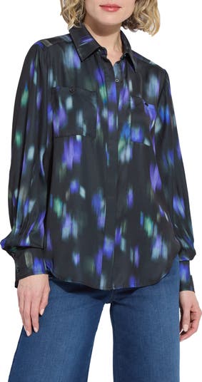 Pleats at the back and cuffs release to create the swingy fit and voluminous sleeves of this lightweight satin shirt that makes a bold statement whether worn loose and flowing or tucked in and blousy.