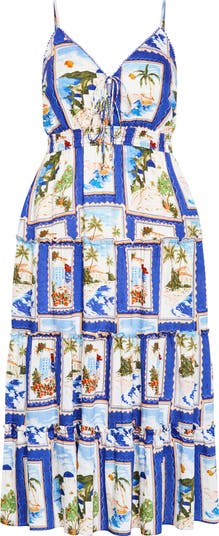 Sway with every step in this vibrantly printed maxi designed with adjustable straps and flouncy ruffle-trim tiers. A smocked waist shapes this sweet silhouette.