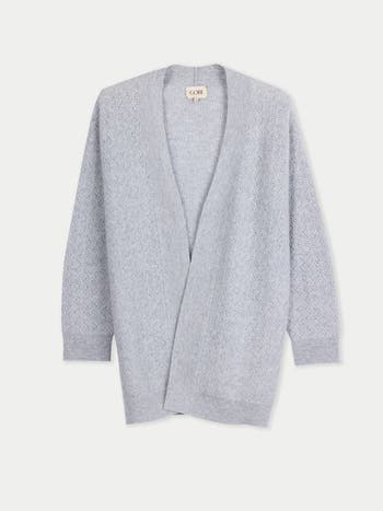 Luxurious cashmere cardigan with delicate Ajour knit texture. Open-front design without belt or buttons for a relaxed drape. Ribbed cuffs and hem add subtle structure, while soft, breathable cashmere provides lightweight warmth and timeless elegance.