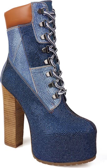 Patchwork denim covered in tonal rhinestones bring eye-catching appeal to an attention-seeking bootie lofted by a towering heel and platform.