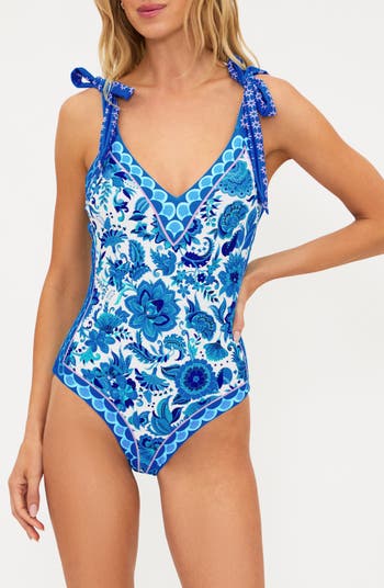 A placement print patterns this stretchy one-piece swimsuit topped by adjustable tie straps for a perfect fit.