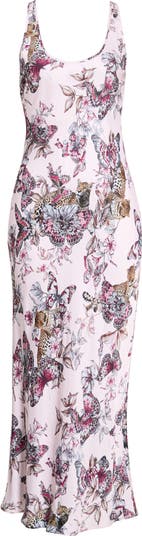 Flora and fauna both make an appearance on a slippery satin slipdress cut seductively on the bias.