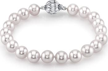 A delicate Akoya pearl bracelet adds refined elegance to the wrist, offering a timeless accessory for both everyday and special occasions.
