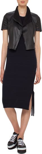 Inspired by the enduringly chic moto jacket, this edgy-meets-elegant topper is cut from rich lambskin leather with a shrunken fit that looks beautiful when layered over your favorite frocks. The suede-lined stand collar adds a bit of textural interest while framing the face, and tonal black hardware completes the polished look.
