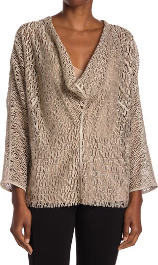 A Roman numeral themed overlay brings contemporary flair to this contemporary cowl neck blouse.
