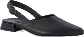 A center seam highlights the pointy toe on a streamlined leather flat featuring a cushioned footbed and adjustable slingback strap that deliver comfortable and secure wear.