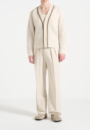 Blending lightweight tailoring effortlessly, the Linen Cardigan With Contrast Placket reinterprets layering through a clean, collarless silhouette and tonal contrast trim. The wide placket detailing runs uninterrupted through the front, anchored by a concealed button fastening that preserves its minimal aesthetic. Crafted in breathable linen, it’s ideal for transitional wear with elevated intent.