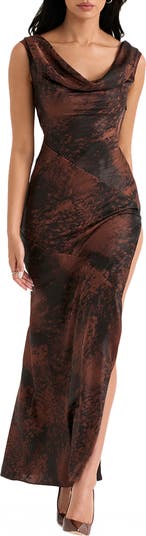 A leg-baring side slit lends sultry appeal to a bias-cut cocktail dress fashioned in luxe satin with a drapey cowl neck that can be worn off the shoulders.