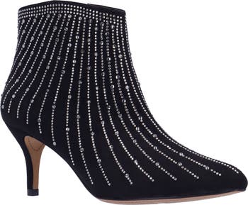 Sparkling embellishments lend contemporary glamour to an evening-ready bootie framed by a pointy toe and tapered heel.