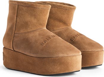 Wool-warmed faux fur lines this calfskin bootie boosted on a sturdy platform sole and branded with signature logo detailing.