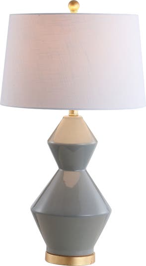 The stacked geometric shape of this modern table lamp serves as a great focal point for any room. Glazed to have a high-gloss effect, the gray finish stands out while being versatile for any color scheme. Topped with an off-white drum shade, this modern design is accented in a gold finish that extends to the matching finial on top.