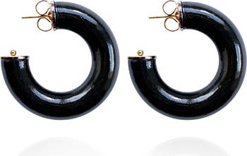 Glossy, sculptural, and surprisingly lightweight statement earrings. | The Alba Hoops feature a smooth, rounded silhouette with a high-shine finish for just enough glow. | Designed to stand out without overwhelming—these hoops turn heads, elevate any look, and never weigh you down. | Minimal effort, maximum presence. | Materials: Hand-painted with Non-Toxic Paints (ACMI’s Approved Product Seal), Wood Base & Top, 18K Gold-plated Hardware, Stainless Steel Post | Size: H: 1.5” W: 1.5” | Weight: 0.18 oz |