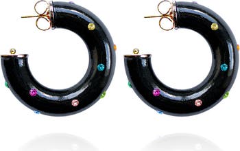 Glossy, sculptural, and surprisingly lightweight statement earrings. | The Alba Hoops feature a smooth, rounded silhouette with a high-shine finish, and shimmering Austrian crystals that add that sharp, unexpected edge. | Designed to stand out without overwhelming—these hoops turn heads, elevate any look, and never weigh you down. | Minimal effort, maximum presence. | Materials: Hand-painted with Non-Toxic Paints (ACMI’s Approved Product Seal), Austrian Crystals, Wood Base & Top, 18K Gold-plated Hardware, Stainless Steel Post | Size: H: 1.5” W: 1.5” | Weight: 0.18 oz |