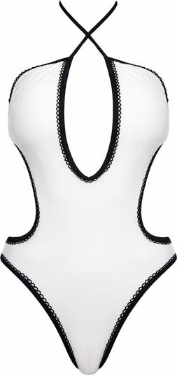 A sleek plunge monokini in soft cream, framed with delicate black lace trim for sharp contrast. Alba sculpts the body with waist cut-outs and clean lines.