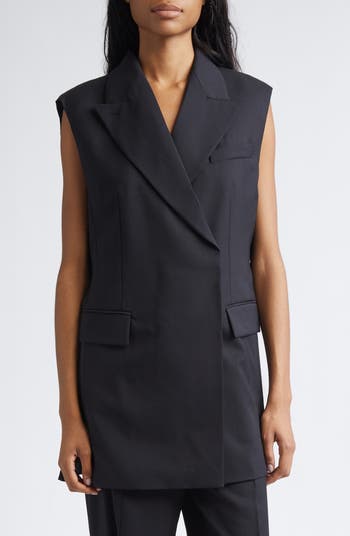 This wool-blend vest with a classic, clean front and hidden buttons belies the unexpectedly swishy pleated back gently draped with a metallic half belt.