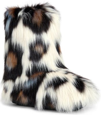 Color-pop spots of sky blue serve to highlight the arresting leopard-spot patterning of this fun faux-fur bootie that takes your outfit to the next level.