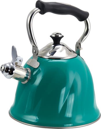 Mr. Coffee Alderton 2.3 Qt. Stainless steel tea kettle with lid, green. Mirror tube swing handle with black bakelite. Product Features Easy cleanup and dishwasher safe Dishwasher-Safe Flip-Up spout cover for safe and easy pouring Stay-Cool handle and knob Emerald green color adds a beautiful accent to any kitchen.