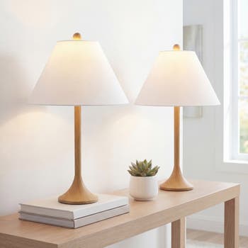 This set of two modern lamps combines clean lines and warm colors for a relaxed, coastal vibe. It features a sturdy metal column base with an angled hardback linen shade. An ideal pair for the bedroom, living room or home office, these lamps include an LED bulb for bright, warm lighting.