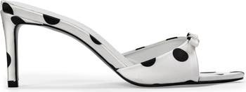Round toe slipper mule with bow detail, set on a straight stiletto heel.