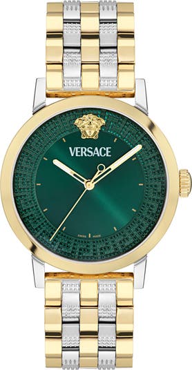 The brand's iconic 3D Medusa head and a geometric motif echo around the sunray dial of this Swiss-made watch featuring quartz-powered movement and set on a two-tone bracelet.