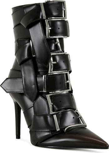 Buckle straps emphasize the modern moto attitude of a pointy-toe bootie lifted by a stiletto heel.