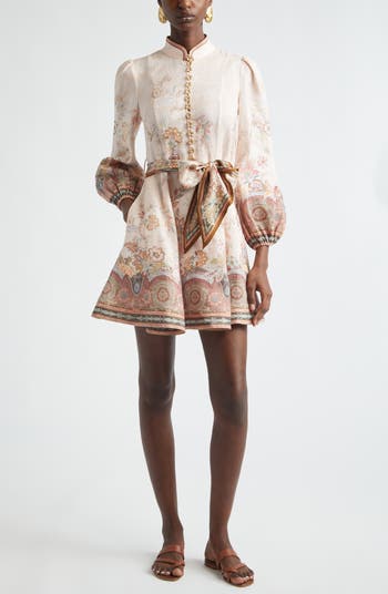 An engineered paisley placement print brings swirling pattern to this long-sleeve linen minidress from the spring '26 collection, Kindred Spirit. Bejeweled flower buttons lead to a high mandarin collar on the romantic design framed with balloon sleeves and cinched with a silk-scarf sash.