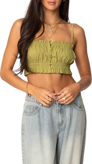 Covered buttons fall down the front of this shirred crop top made of breezy linen and cotton.