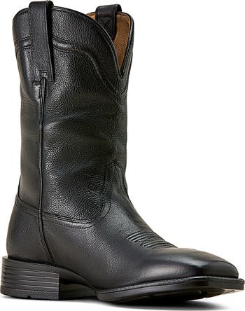 Smooth leather and a wide square toe give this Western boot an authentic cowboy stance grounded by a sturdy stacked heel.