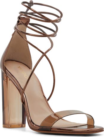 A translucent vamp strap and block heel amplify the trendsetting appeal of a metallic sandal styled with wraparound ankle ties for modern allure.