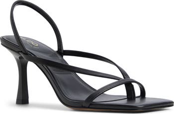 An elasticized slingback strap and center toe post provide a secure fit on square-toe sandal featuring a dual-density foam footbed and tapered heel.