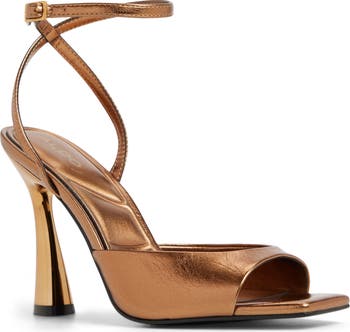 A scooped topline and squared-off toe bring crisp angles to a two-piece leather sandal set on a dual-density foam footbed and towering flare heel.