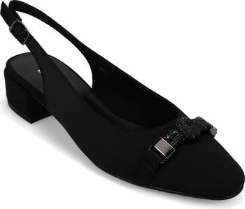 A jewel-encrusted accent stands out at the instep of a slingback pump set on a cushioned footbed and low block heel.