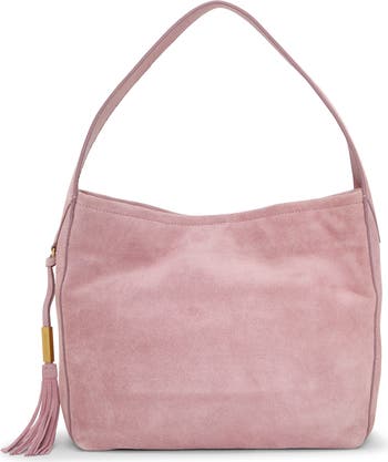 Aged-finish hardware and a decorative tassel highlight the creamy suede exterior of a spacious bag designed with multiple pockets and suspended from a wide shoulder strap.