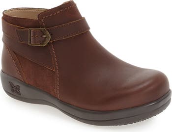 Built for comfort and stability, this mixed-finish leather bootie features a roomy toe box, a cork-and-memory-foam footbed, and a slip-resistant rubber sole. The full-length zipper and wraparound side buckle add a trend-right finish.