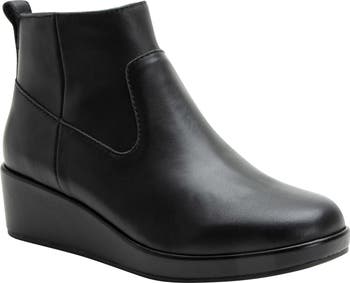 A subtle platform and integrated wedge heel elevate a cushioned leather bootie grounded by a slip-resistant sole.