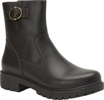 A cushioned, arch-supporting insole adds impeccable comfort to a buckle-embellished bootie grounded by a lug sole.