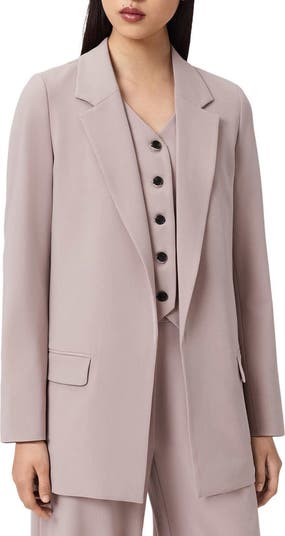 A polished blazer is updated in a longline silhouette with comfortable stretch for a tailored fit and an open front for easy layering.