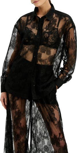Mix business with pleasure in this oversized button-up made from beautifully delicate, sheer lace that brings dark romance to your after-hours looks.