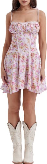 Sugar and spice play oh-so-nice on a blossom-tossed dress built with a bustier bodice.
