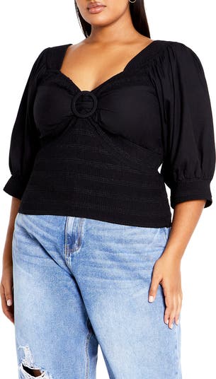 Sweet smocking shapes the silhouette of this cropped top framed by billowed sleeves and fronted with a contrasting ring detail.