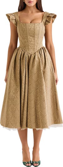 Make your entrance unforgettable in this opulent minidress featuring a Renaissance-inspired jacquard pattern. It has a corset-inspired bodice with structural boning and a voluminous skirt with layers of tulle for extra drama.