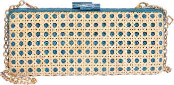 Long clutch in natural rattan "solihiya" caning with ocean blue raffia trim. Shell inlay clasps, fully lined with gold chain shoulder strap.
