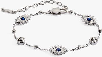 The Evil Eye Satellite Chain Inline Bracelet features studded edge evil eye stations dotted with clear and sapphire crystals along a shimmering stainless steel beaded chain. Symbolizing protection and empowerment, this bracelet brings meaningful style to any stack or shines boldly on its own. Perfect for those who love whimsical jewelry with a meaningful message.
