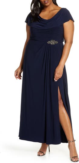Make the evening memorable in this elegant cowl neck gown made from flattering stretch materials and featuring a pretty pleated bodice with sparkling detail.