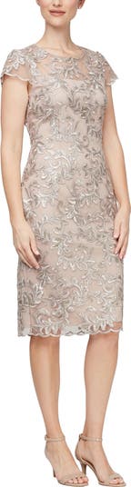 Shimmering sequins form beautiful branches on an enchanting dress fashioned with fluttering cap sleeves in an elegant sheath silhouette.